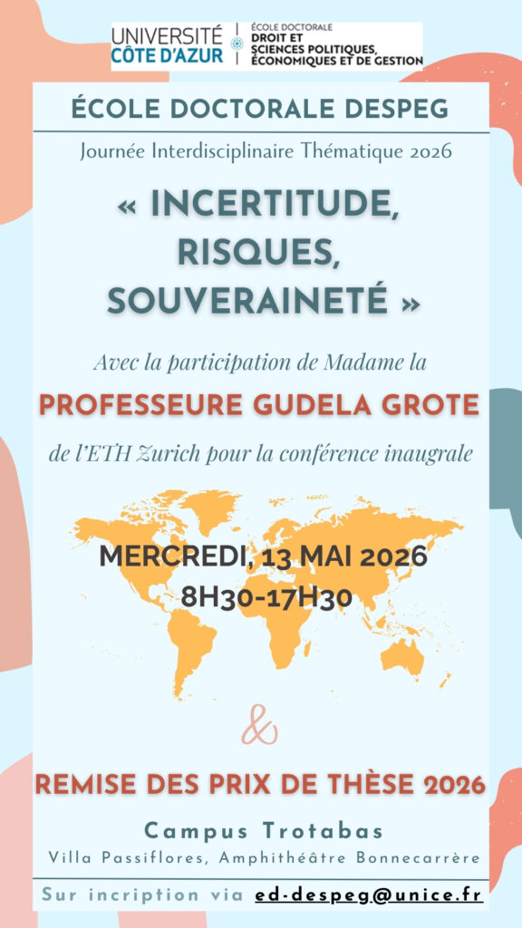 En 2025, les Doctoriales de l’ED DESPEG ont porté sur le thème » Le(s) Politique(s) face aux Crises » . Nous avons accueillies 12 contributions de doctorants de l’ED DESPEG organisées en 4 sessions. Notre invité, Monsieur Vicent Martigny, Professeur de Science Politique a Université Côte d’Azur et a l’Ecole Polytechnique nous a offert une conférence ayant pour titre L’hyperpresidence : remède aux crises ou source des crises de la Politique ? Sa conférence ainsi qu’une sélection de contributions sont en cours de publication dans la revue LexSociety.